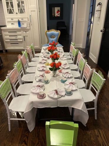 Princess Tea Parties include colorful Tea pots and child size teacups plus dessert plates. 1 table scape, White Chiavari chairs with organza sashes, tables are covered in white tablecloths, we use white cloth napkins, and three tier cake stands. Clients provide food and beverage